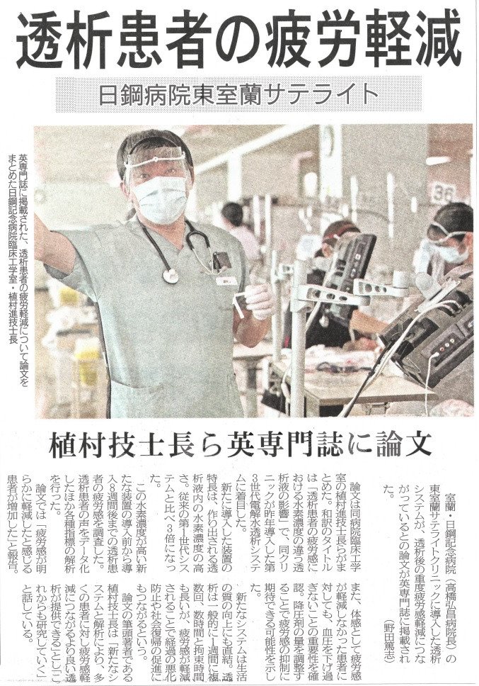 2022年12月08日(木) 東室蘭サテライトクリニック 植村技士長の論文紹介記事が「北海道医療新聞」「室蘭民報」に掲載されました。 平素より当クリニックをご利用いただき、誠にありがとうございます。 12/5 北海道医療新聞 12/6 室蘭民報 に、東室蘭サテライトクリニックにてデータ解析を行った植村技士長らの論文「透析患者の疲労感における水素濃度の違う透析液の影響(和訳)」の紹介記事が掲載されました。 北海道医療新聞2022年12月5日発行号掲載 室蘭民報2022年12月6日掲載(室蘭民報提供)