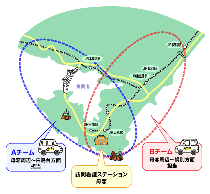 室蘭市〜登別市(一部)を対象に、2チーム制で訪問看護を実施しています