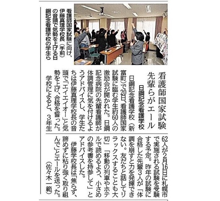 2025年10月03日(金) 看護師国家試験先輩らがエール 1月20日に年2月16日に行われる看護師国家試験に向けて、3年生にエールを送る歓迎会が行われました。 学校長挨拶、先輩からの受験アドバイス、そして恒例の学校長のエイ エイ オーで3年生に気合が入ります。 令和7年1月21日 北海道新聞 朝刊掲載 看護師国家試験先輩らがエール 【北海道新聞社許諾D2510-2604-00030353】